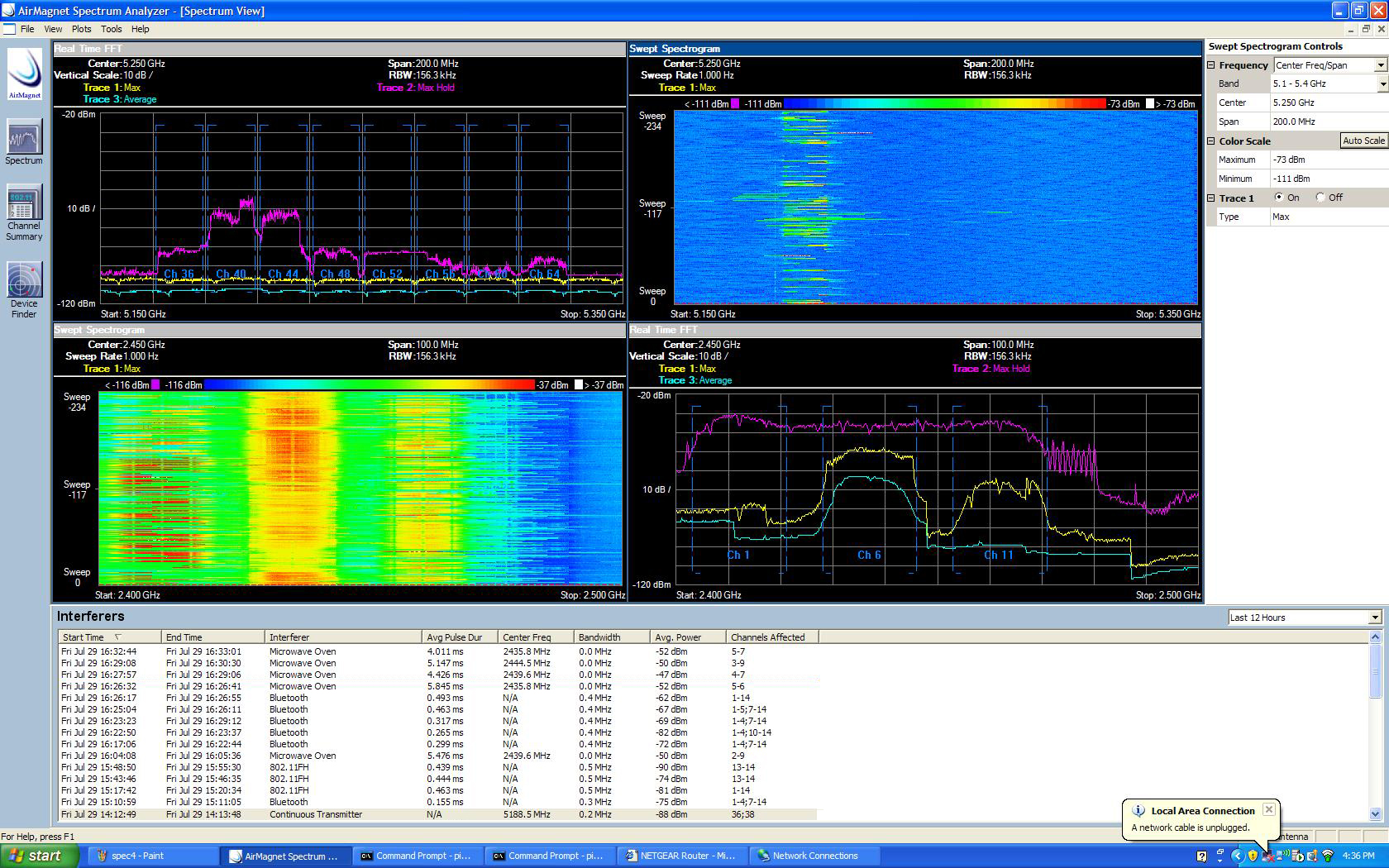 下图是艾尔麦公司的在DefCon会议中的无线频谱分析仪发现5G的干扰情况,图中也显示了大会上发现的如:微波炉、蓝牙设备等其它干扰源情况: